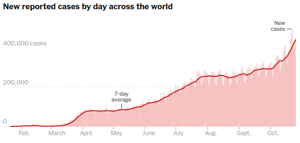 The graph shows three stages of accelerated growth: March-April, June-July, and from October onward. Since the total reflects the spread of disease in different regions, it is natural that it looks like the sum of different logistic curves.