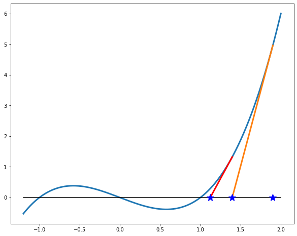 The idea of Newton’s method is geometrically natural. We want to solve \(f(x) = 0\) but since \(f\) may be complicated, we replace it by its linear approximation (tangent line at a certain point). The resulting linear equation is easy to solve. Of course, its solution is probably not a solution of the original equation, but perhaps it is close to it. The process repeats, using the previously found solution as a new point at which to draw a tangent line. A static image of this process is below. Interactive visualization is also available.